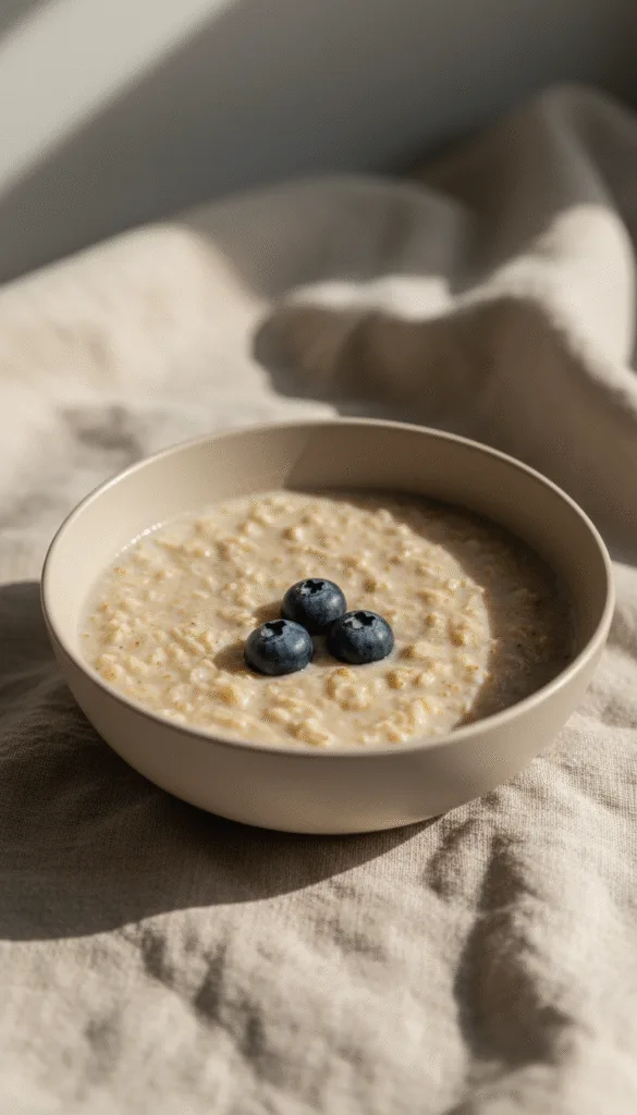 Description: This is oatmeal in its most honest and calming form. A simple bowl of creamy, slow-cooked oats provides a warm and comforting canvas. A few intentionally placed berries add a touch of color without creating clutter, inviting a moment of quiet appreciation.