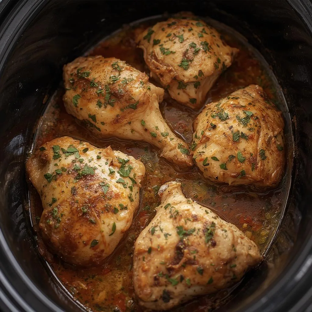 2. Optional searing: For enhanced flavor, heat 1 tablespoon of oil in a skillet over medium-high heat. Sear the chicken thighs skin-side down for 3-4 minutes until golden brown. This step is optional but adds depth to your Slow Cooker Garlic Herb Chicken Thighs.